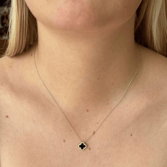 Black Enamel Vintage Lucky Clover Necklace in Silver