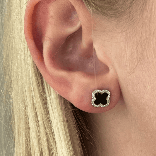 Black Enamel Vintage Lucky Clover Stud Earrings in silver