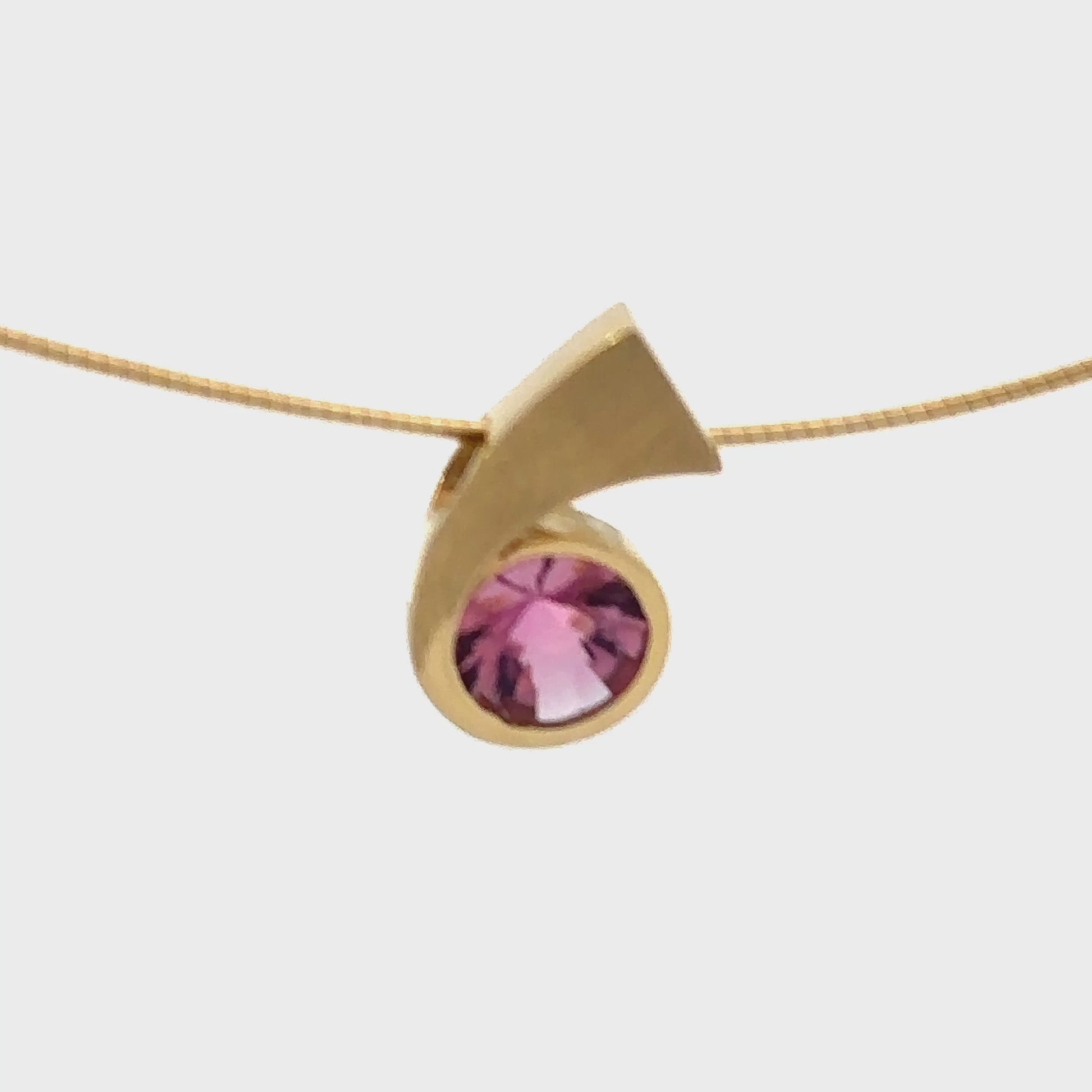 Indulge in the breathtaking beauty of this exquisite 18ct yellow gold and pink Rubelite pendant. The soft, matte finish of the gold perfectly complements the vibrant hue of the Rubelite stone, making this piece a true statement of elegance and sophistication. The pendant's unique coma shape adds a touch of individuality, making it truly one of a kind. Suspended on an 18ct neckwire, this pendant is as practical as it is beautiful, ensuring it will be treasured for years to come.