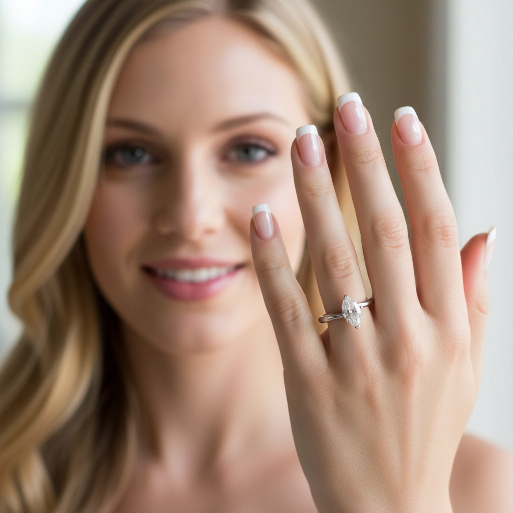 Electrify her heart with this dazzling Platinum marquise 0.70ct diamond ring! This stylish engagement piece features an enchanting diamond held in a four-prong setting between two curving bands of precious metal. Experience the sparkling beauty of this eye-catching diamond ring! Celebrate your commitment with a look that radiates confidence and power.