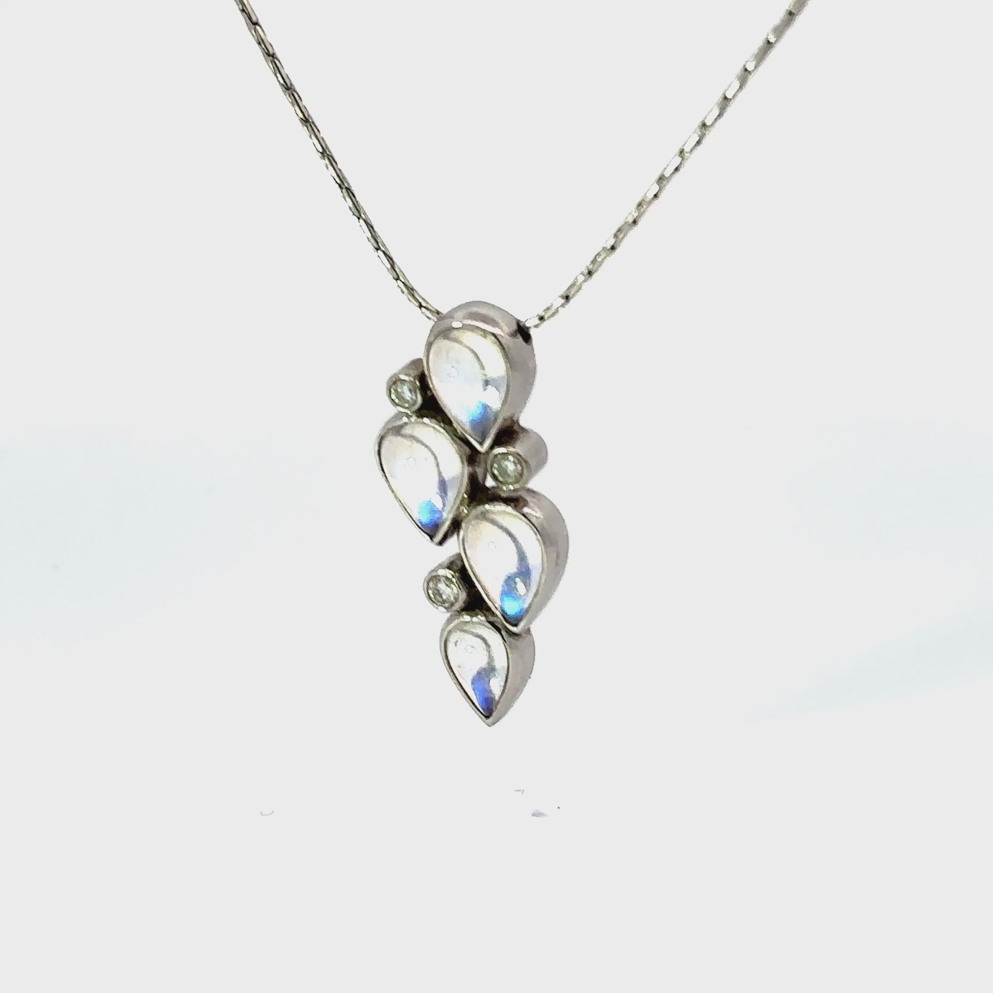 This sumptuous 18ct white gold necklace boasts a quartet of teardrop moonstones and three shimmering diamonds, combined to create a breathtakingly opulent pendant. The moonstones, with their enchanting iridescence, and the brilliant-cut diamonds sparkle in perfect unison, dangling gracefully from a chain of the same hue. A masterful piece of jewellery fit for any occasion, this ravishing moonstone and diamond pendant is a magnificent addition to any connoisseur's collection.