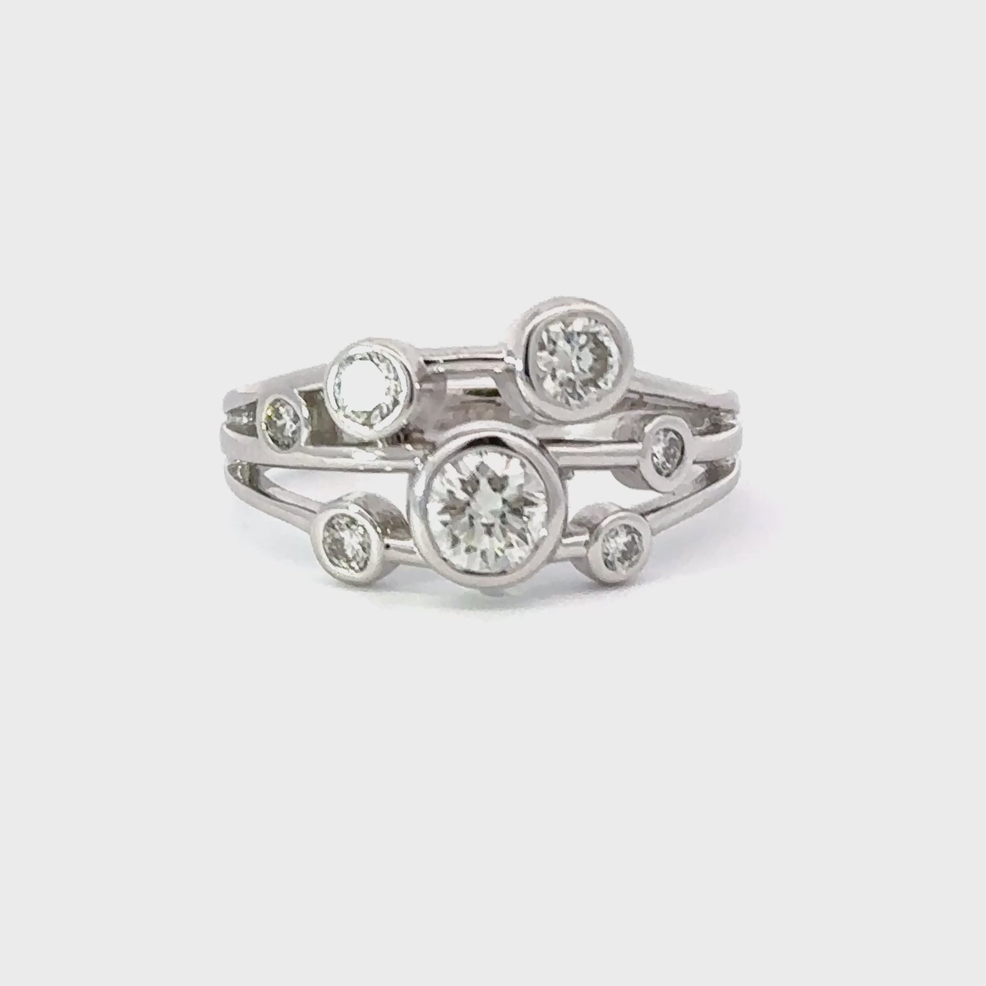 Admire this exquisite 18ct white gold diamond bubble ring! Sparkling seven diamonds are artfully arranged across three bands, creating a timeless and captivating style. Perfect for any special occasion, this dazzling statement piece will have everyone in awe and won't disappoint! Don't miss out on this show-stopping gem - it's guaranteed to put a smile on your face!